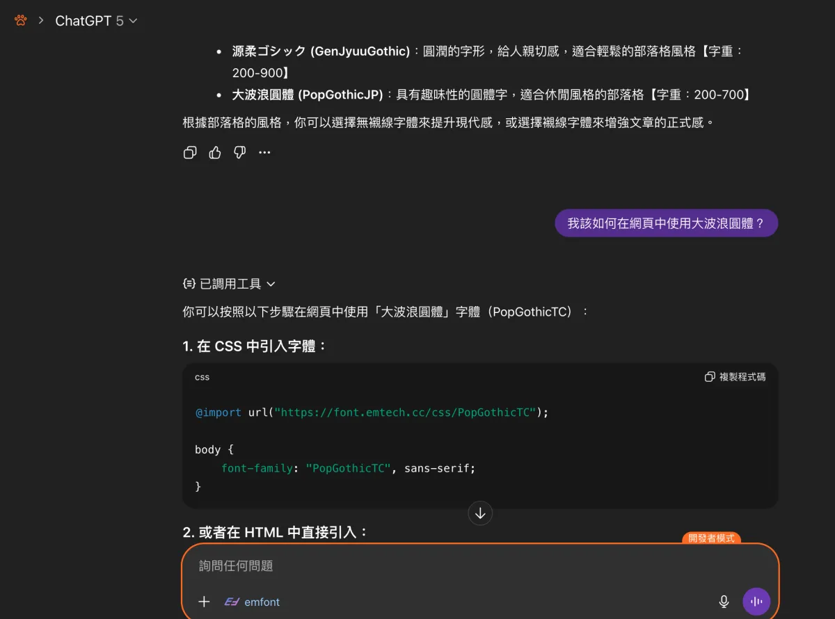 點選「建立」,你就可以開始使用 emfont MCP 囉!聊天時你可以點擊 「+」 號、「更多」、選擇「emfont MCP」來提醒 ChatGPT 記得使用。聊天過程中他想要從 emfont 找字體時會先經過你的同意。